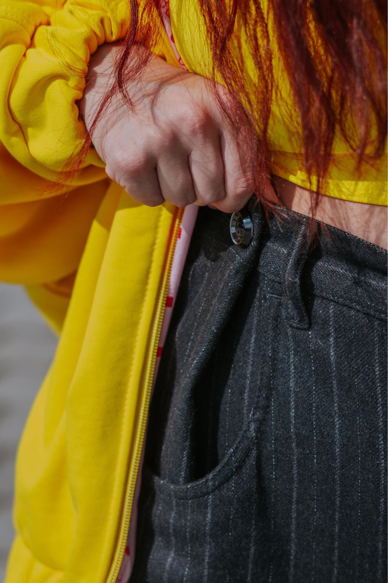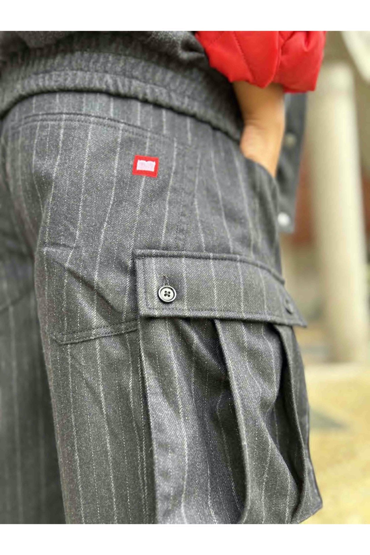 Calças cargo em fazenda cinzenta com risca de giz. Bolsos com forro contraste. Bolsos grandes atrás. Aperta com fecho e botão. Ajusta-o ao teu tamanho. Todos os tamanhos, diferentes formas de usar. Moda e inovação num único produto.